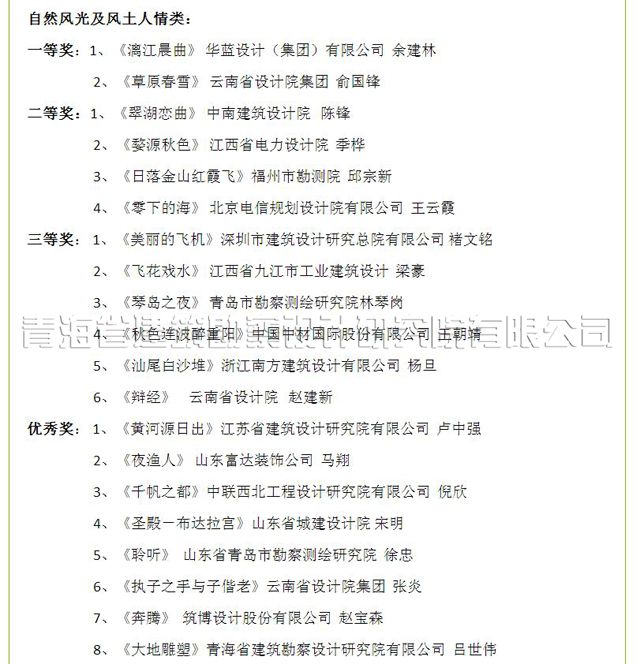 近期,根據(jù)中國勘察設(shè)計(jì)協(xié)會(huì)《關(guān)于公布首屆全國勘察設(shè)計(jì)行業(yè)攝影大賽獲獎(jiǎng)名單的通知》(中設(shè)協(xié)字[2015] 52號(hào)),我院生產(chǎn)經(jīng)營部主任呂世偉同志提交的參賽作品《大地雕塑》獲自然風(fēng)光及風(fēng)土人情類優(yōu)秀作品獎(jiǎng),這是我院自建院以來,在全國舉辦的有影響的攝影比賽中實(shí)現(xiàn)的又一新突破,特向獲獎(jiǎng)?wù)弑硎咀YR!
