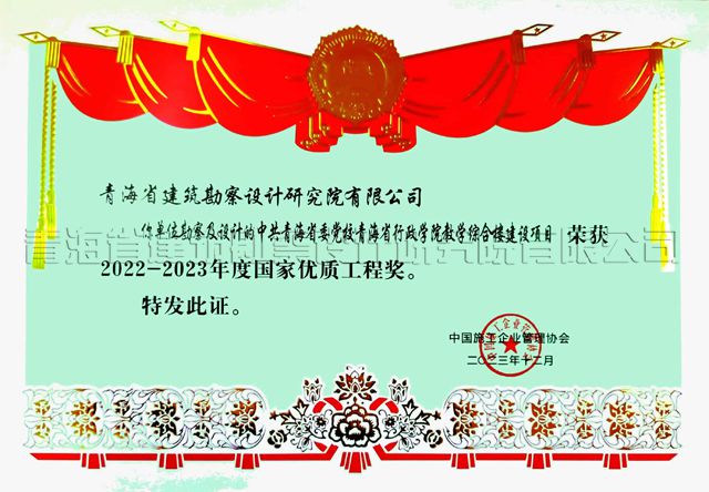 近日,中國建筑業(yè)協(xié)會、中國施工企業(yè)管理協(xié)會評選的2022-2023年度國家級優(yōu)質(zhì)工程獲獎名單揭曉,由我院巖土公司勘察的“中共青海省委黨校青海省行政學院教學綜合樓建設項目”獲“國家優(yōu)質(zhì)工程獎”。