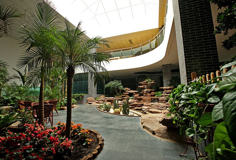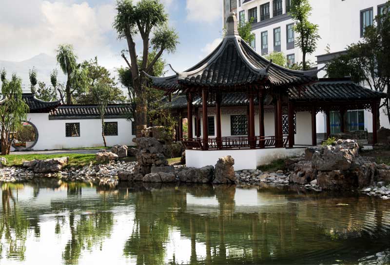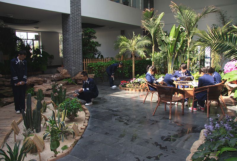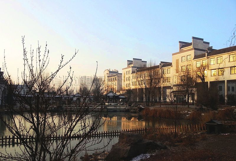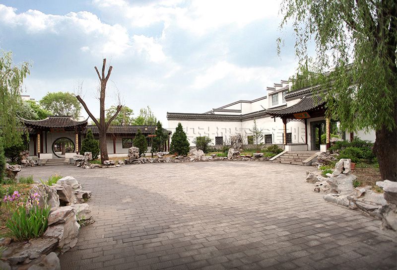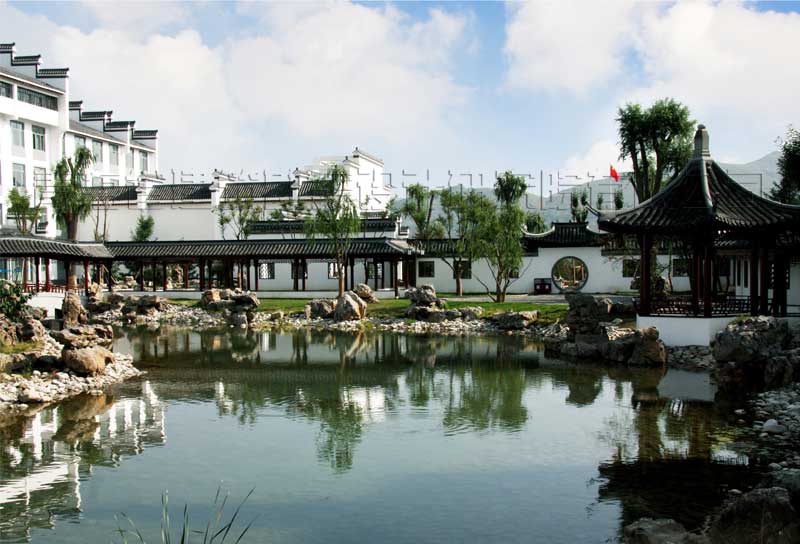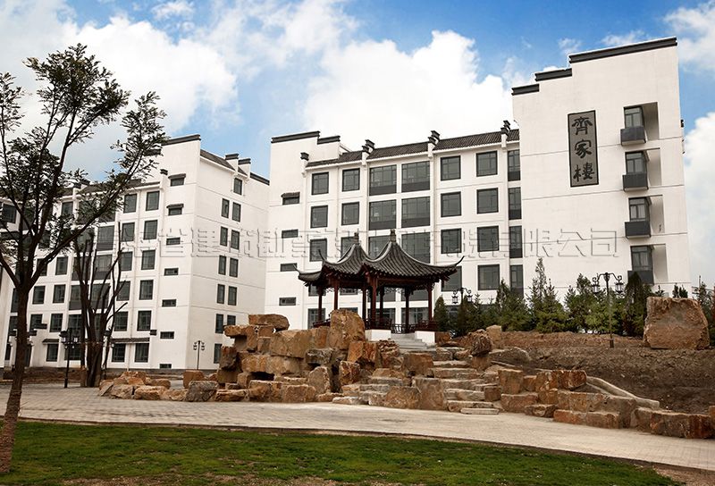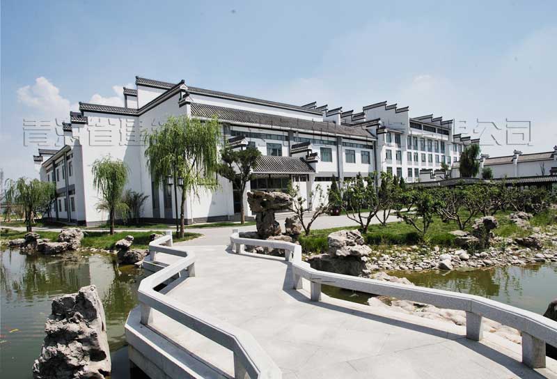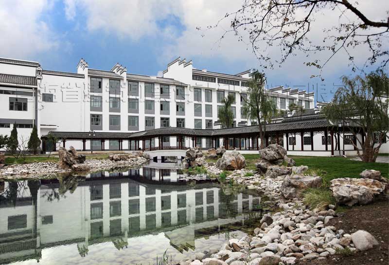 校區(qū)主入口設在南端,人流出入口寬24米,車流設9米寬獨立出入口,遠離城市主干道,通過校區(qū)主要入口進入校前廣場,辦公區(qū)布置在廣場東側靠規(guī)劃路,教學區(qū)布置在廣場西側最安靜區(qū)域,餐廳及宿舍布置在西北角,400米運動場布置在用地東北角,臨城市主干道。規(guī)劃采用集中緊湊的功能布局結構,將教學、生活及運動區(qū)用簡潔三角形空間連接,最大限度縮短師生步行距離,并通過大小不同的主題廣場、綠化、湖面將三部分有機連為一體。在學校的創(chuàng)作中,建筑師結合學校辦學思想和理念,確認以“簡徽”建筑風格及“蘇州”園林景觀的設計思路,通過對設計思路反復論證、研討、修訂,歷時一年完成新校建筑設計方案及施工圖設計。